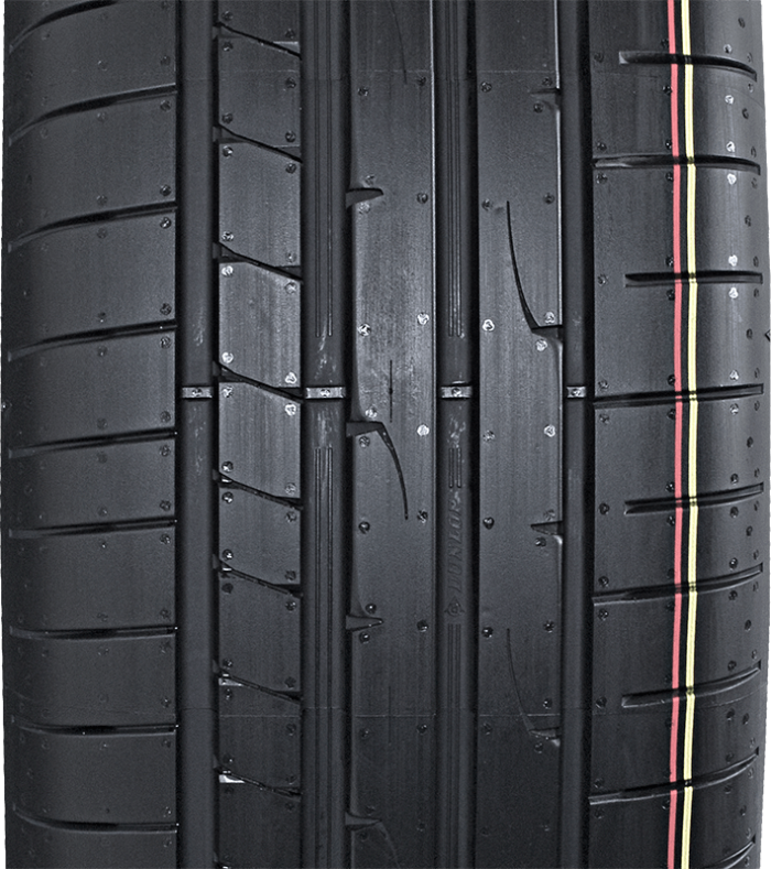 The advantages of this solution invented by Dunlop include multi-angle layout, which provides up to ten different radii to the tyre structure. The pressure is evenly distributed, providing more precise manoeuvring, gentle cornering and smooth acceleration. The special geometry of the individual components optimises the rigidity of the pads, providing shorter braking distance, especially at very high speeds.