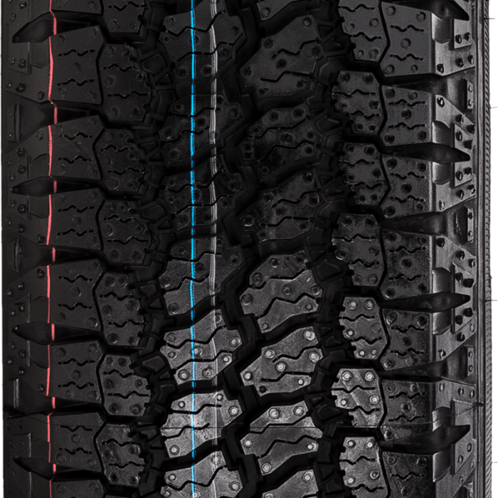 Goodyear Wrangler AT ADV protects your car from skidding and dries independently when driving on mud or water. All this is thanks to the refined symmetric tread, which consists of individual ridges separated by deep drainage grooves. Additionally, it has deep notches running to the side of the tyre. With such a design, the tyre is reliable even on wet surfaces. The manufacturer managed to obtain a relatively low rolling resistance, which improves the comfort of driving. The rubber is abrasion resistant, ensuring an even wear and high performance throughout its lifespan.