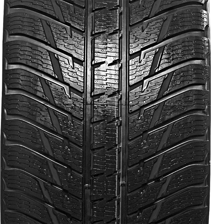 The directional tread improves driving comfort, and the longitudinal central rib offers driving stability both on dry roads and on snow, slush and ice. The stabilisers on the sides of the tread next to the longitudinal ribs and central rib provide additional rigidity, and the three-dimensional tread lock blades improve drivability and ensure line holding stability not only on straight roads, but also during sudden manoeuvres and when going round corners. Efficient and rapid dispersal of water and slush is guaranteed by a strong arrow-like tread pattern, deep transverse grooves and polished main grooves, which deliver the necessary grip regardless of the weather. The compound used to manufacture the Nokian WR SUV 3 offers guaranteed resistance to wear at any temperature, ensuring that the tyre can achieve a full range of performance values for even longer.
